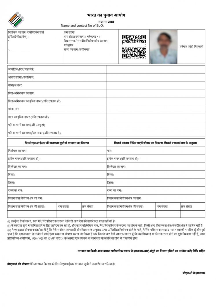भारत निर्वाचन आयोग द्वारा SIR के लिए जारी गणना प्रपत्र (एन्यूमरेशन फॉर्म) का प्रारूप निम्नानुसार है: