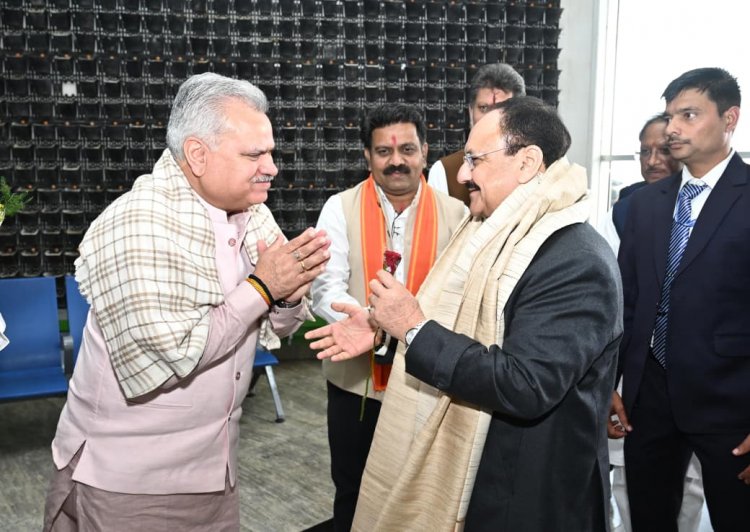 रायपुर। भाजपा राष्ट्रीय अध्यक्ष एवं केंद्रीय स्वास्थ्य मंत्री जेपी नड्डा आज दोपहर रायपुर पहुंचे। रायपुर विमानतल में मुख्यमंत्री विष्णुदेव साय, भाजपा प्रदेश अध्यक्ष किरण देव, क्षेत्रीय संगठन महामंत्री अजय जम्वाल , उप मुख्यमंत्री विजय शर्मा, सांसद बृजमोहन अग्रवाल, प्रदेश महामंत्री अखिलेश सोनी, डॉ. नवीन मार्कंडेय, प्रदेश उपाध्यक्ष नंदन जैन, प्रदेश कोषाध्यक्ष राम गर्ग , नागरिक आपूर्ति निगम अध्यक्ष संजय श्रीवास्तव सहित भाजपा पदाधिकारियों ने स्वागत किया।