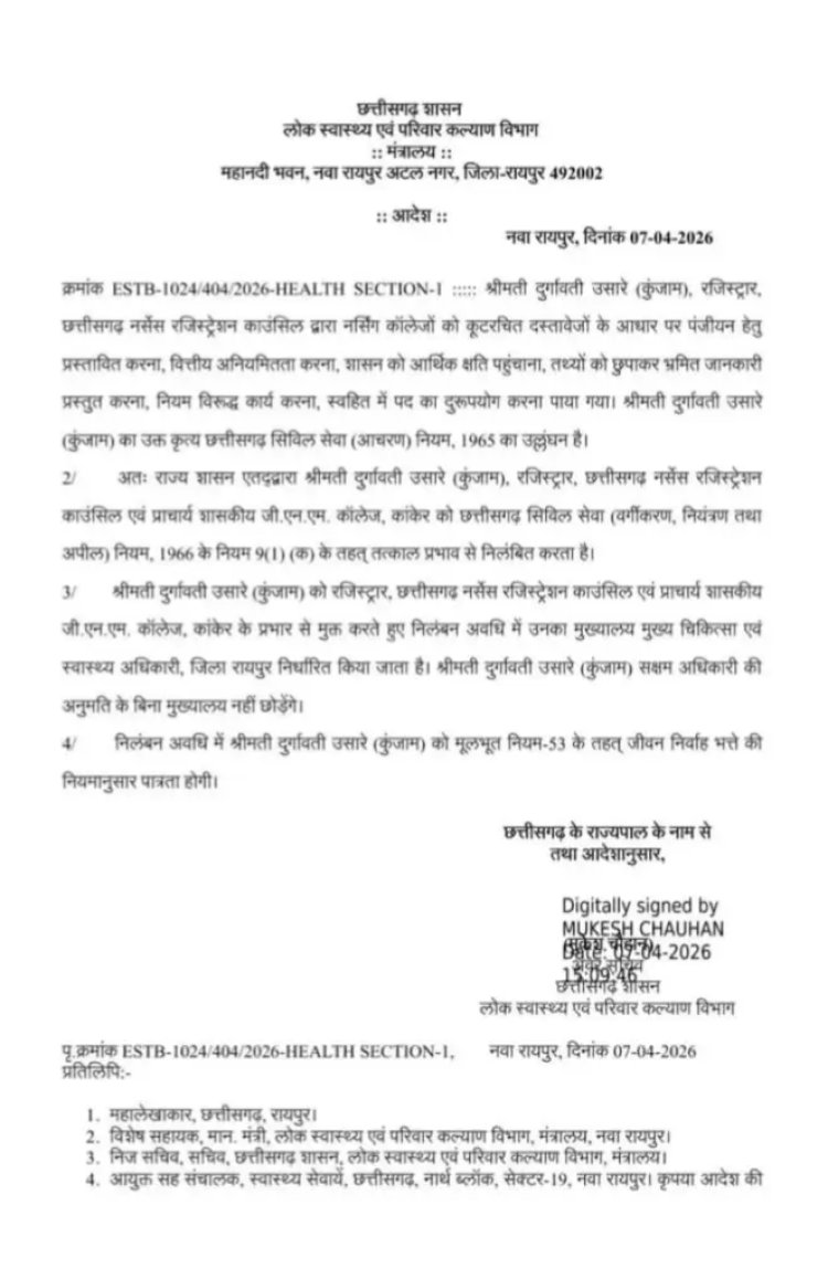 रायपुर। छत्तीसगढ़ नर्सिंग काउंसिल की रजिस्ट्रार दुर्गावती कुंजाम (उसारे) को प्राइवेट नर्सिंग कॉलेजों में कथित फर्जीवाड़े और गंभीर अनियमितताओं के आरोपों के चलते चिकित्सा शिक्षा विभाग ने बुधवार को तत्काल प्रभाव से निलंबित कर दिया। नर्सिंग कॉलेजों की मान्यता और निरीक्षण प्रक्रिया में गड़बड़ियां सामने आने के बाद शासन ने यह सख्त कार्रवाई की है।