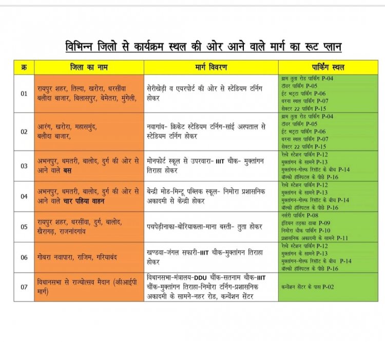 रायपुर। 1 नवंबर को प्रधानमंत्री नरेंद्र मोदी का रायपुर छत्तीसगढ़ में प्रवास कार्यक्रम प्रस्तावित है। प्रधानमंत्री माना विमानतल में आकर विभिन्न कार्यक्रमों में शामिल होंगे। नवा रायपुर में आयोजित कार्यक्रमों में सम्मिलित होने वाले व्हीआईपी एवं नागरिकों के सुरक्षित एवं सुगम आवागमन तथा वाहनों की पार्किंग के लिए मार्ग व पार्किंग स्थल निर्धारित किया गया है। राज्योत्सव स्थल पहुॅचने वालों की सुविधानुसार पहुंच मार्गों को 6 रूट में विभाजित किया गया है। तथा प्रत्येक रूट में पार्किंग स्थल निर्धारित किया गया है जो निम्नानुसार है