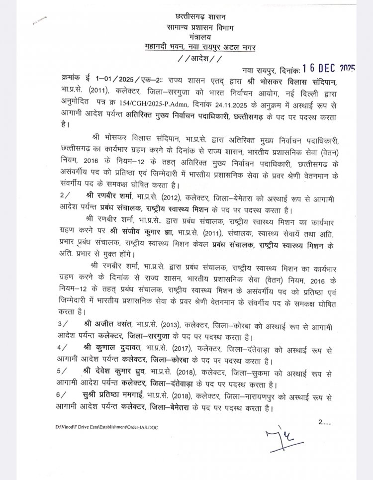 Transfer Breaking : आईएएस अधिकारियों का तबादला,कलेक्टर बदले गए,आदेश जारी