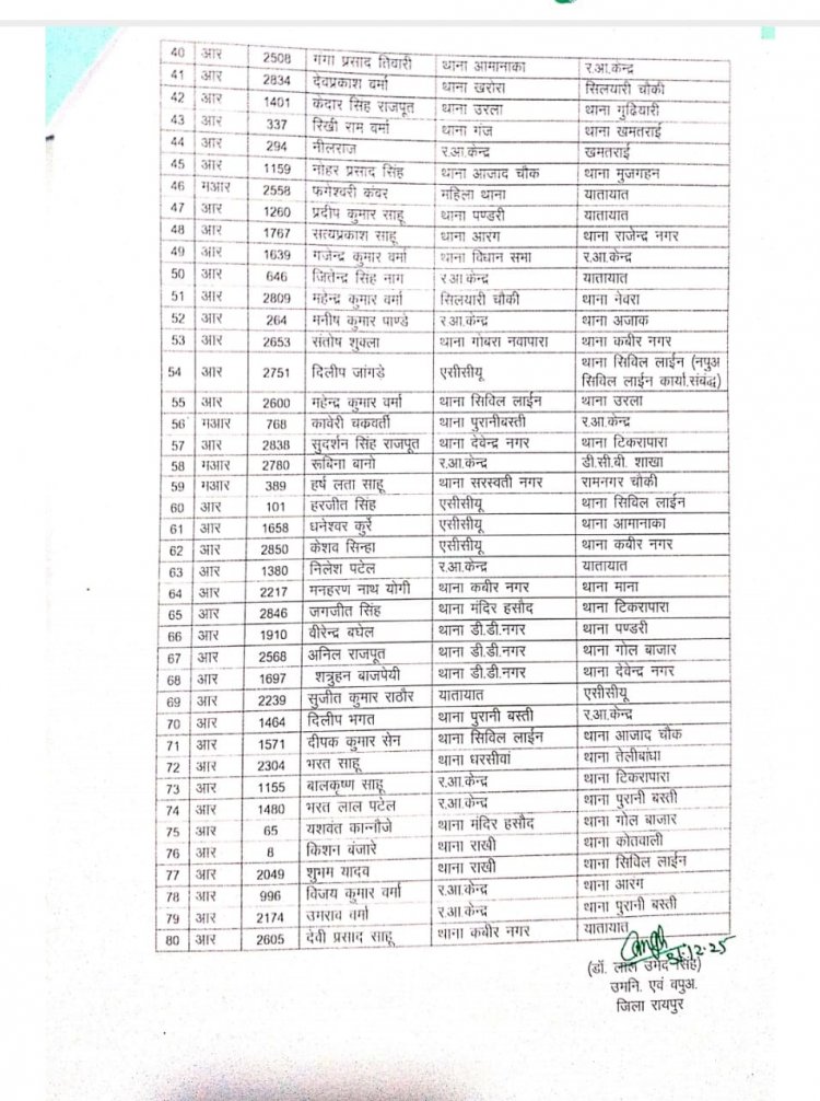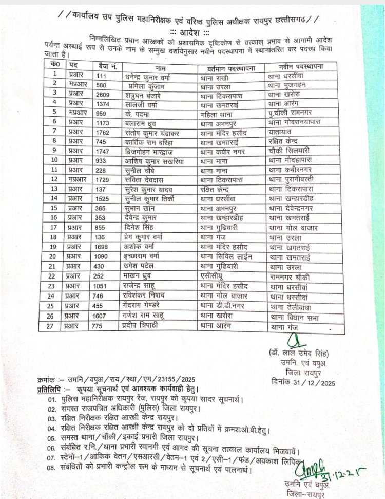 रायपुर पुलिस में बड़ा फेरबदल: साल के विदाई के साथ 107 पुलिसकर्मियों का तबादला, SSP ने जारी की सूची